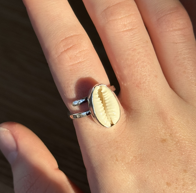 Made with 100% recycled sterling silver, natural cowrie shell, finished with a hammered effect.