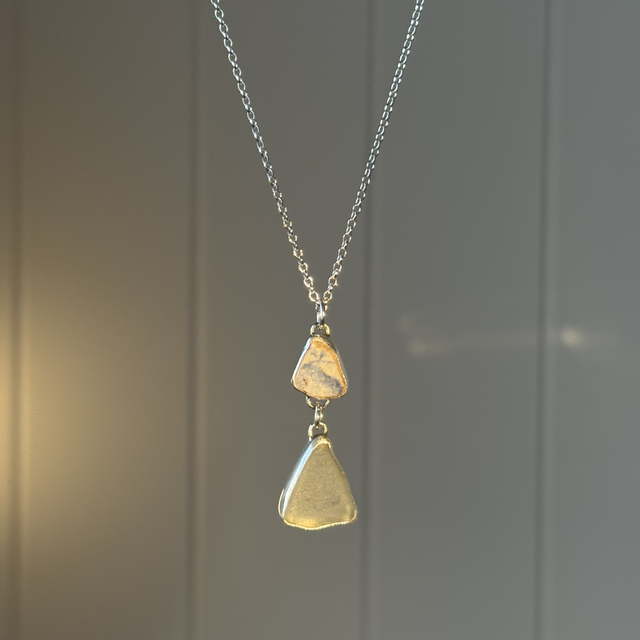 This unique necklace is hand made with 100% recycled sterling silver. Each piece of sea glass and sea pottery is found my me on the coast of Pembrokeshire, and encased in sterling silver.