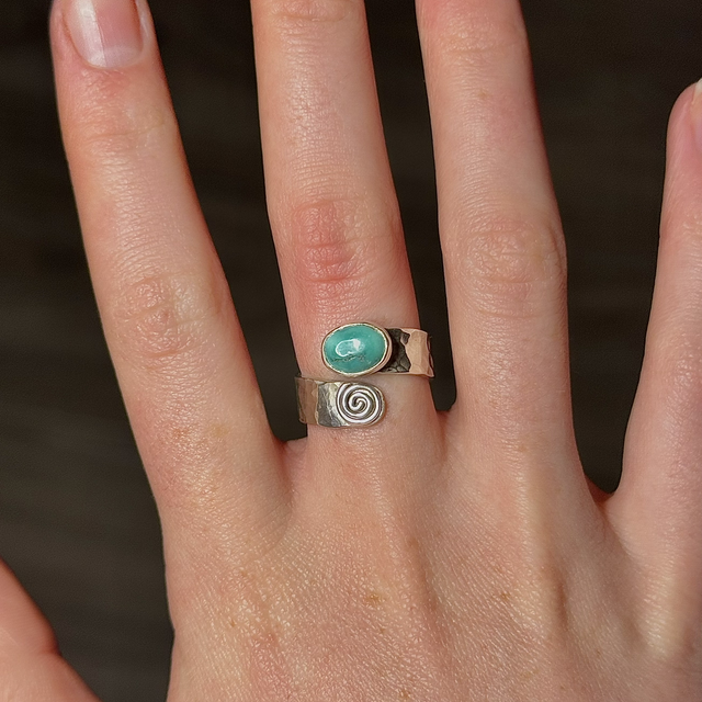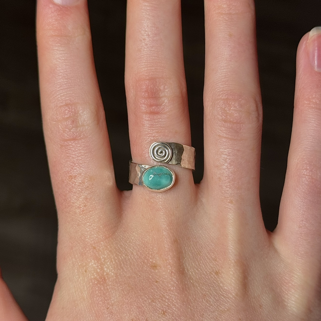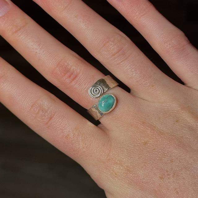 Handmade with 100% recycled sterling silver, natural turquoise, a swirl detail, and finished with a hammered effect.